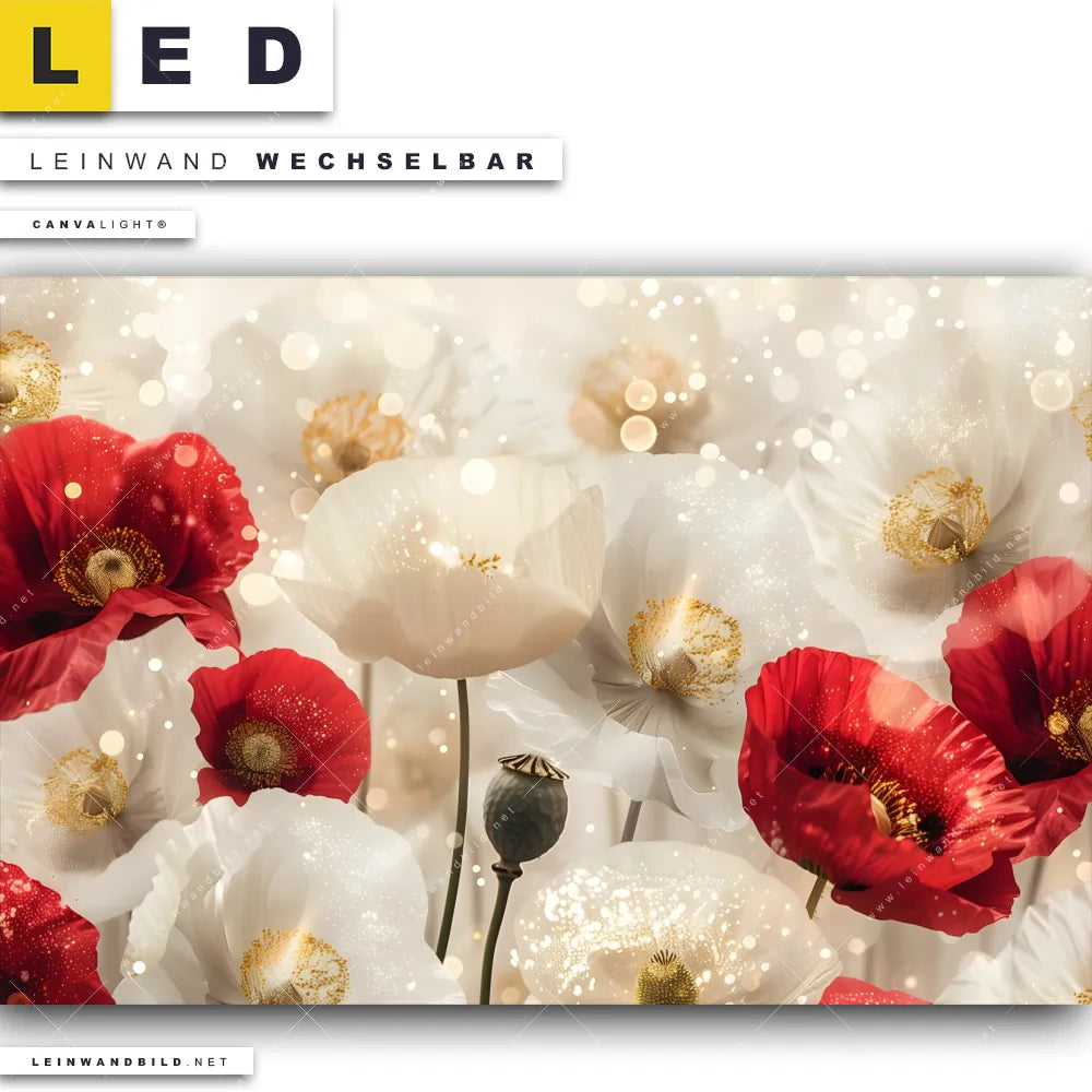 Du bist auf der Suche nach einem Blumen - Botanik LED Leinwandbild im Querformat? Begriffe wie Pflanze, Natur, Blüten, Mohnblumen, Blumenwiese, Glitzer, Blütenmeer, Klatschmohn haben Dich auf der Suche nach Deinem neuen XXL LED Wandbild mit wechselbarer Leinwand inspiriert? Farben wie Weiss, Rot, Gold dürfen auf Deinem neuen breiten Leinwand-LED-Bild nicht fehlen und Leuchtbilder im Floral, Modern Art Stil passen perfekt zu Deinem Einrichtungsstil?