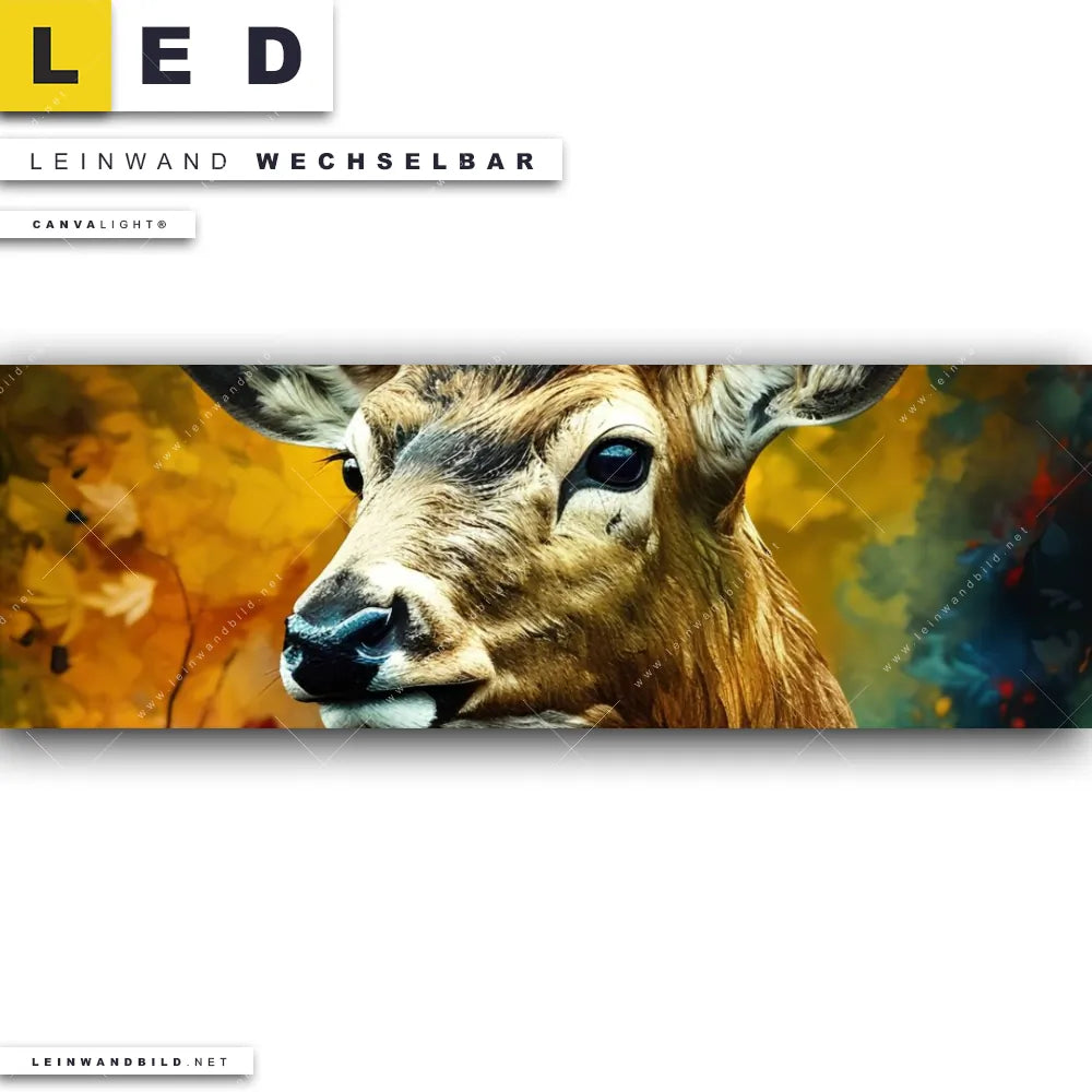 Du bist auf der Suche nach einem Tierwelt LED Leinwandbild im Panorama-Format? Begriffe wie Hirsch, Deer, Wald, Rotwild, Reh, Laub, Herbst haben Dich auf der Suche nach Deinem neuen XXL LED Wandbild mit wechselbarer Leinwand inspiriert? Farben wie Beige, Braun, Rot dürfen auf Deinem neuen extra breiten Leinwand-LED-Bild nicht fehlen und Leuchtbilder im Retro - Vintage Stil passen perfekt zu Deinem Einrichtungsstil?