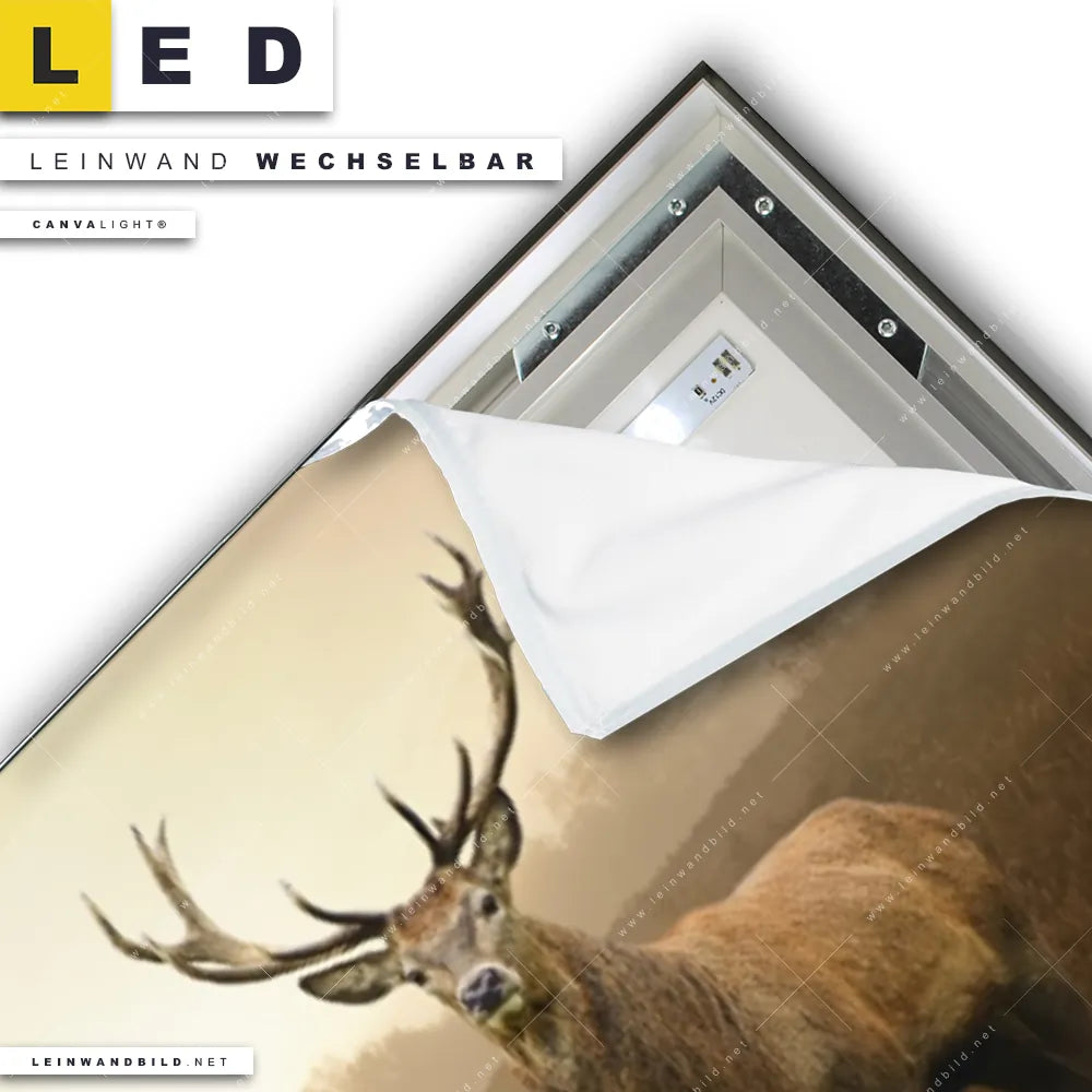 Du konfigurierst Dein individuelles LED Leinwandbild Canvalight® TEX | Rothirsch im Nebel | Panorama und wir produzieren es NEU für Dich. Unsere Landschaften, Tierwelt LED Bilder mit wechselbarer Textil-Leinwand sind KEINE Lagerware. Du bist Dir unsicher, welches Motiv oder Format das richtige für dein individuelles Canvalight® Leuchtbild ist, dann helfen wir dir gerne weiter und beraten dich!