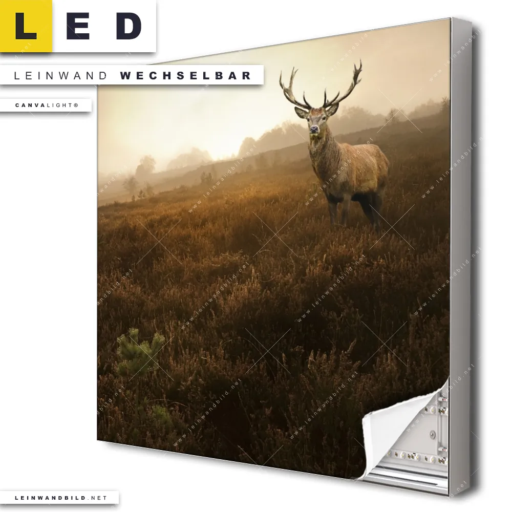 Du bist auf der Suche nach einem Landschaften, Tierwelt LED Leinwandbild im Quadratischen Format? Begriffe wie Nebel, Natur, Hirsch, Deer, Wild, Rotwild, Wiese, Weide, Feld, Wald haben Dich auf der Suche nach Deinem neuen XXL LED Wandbild mit wechselbarer Leinwand inspiriert? Farben wie Beige, Braun dürfen auf Deinem neuen Leinwand-LED-Bild nicht fehlen und Leuchtbilder im Natürlich - Realistisch Stil passen perfekt zu Deinem Einrichtungsstil?