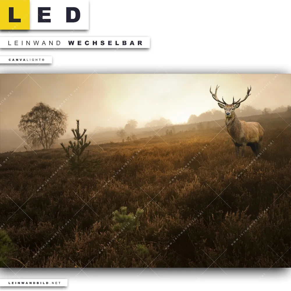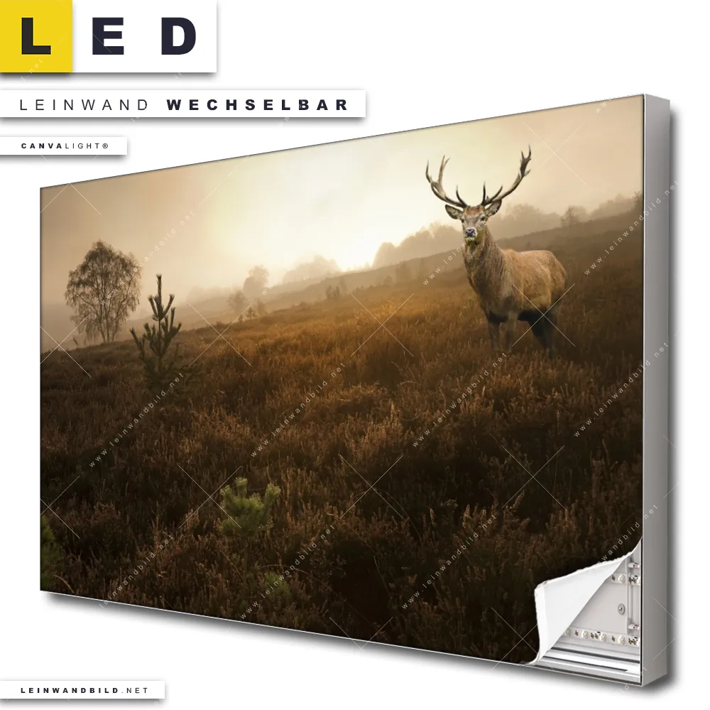 Du bist auf der Suche nach einem Landschaften, Tierwelt LED Leinwandbild im Querformat? Begriffe wie Nebel, Natur, Hirsch, Deer, Wild, Rotwild, Wiese, Weide, Feld, Wald haben Dich auf der Suche nach Deinem neuen XXL LED Wandbild mit wechselbarer Leinwand inspiriert? Farben wie Beige, Braun dürfen auf Deinem neuen breiten Leinwand-LED-Bild nicht fehlen und Leuchtbilder im Natürlich - Realistisch Stil passen perfekt zu Deinem Einrichtungsstil?