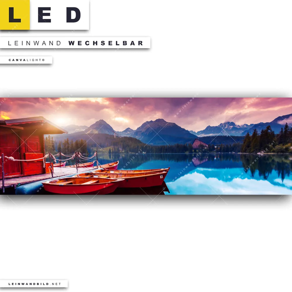 Du bist auf der Suche nach einem Landschaften LED Leinwandbild im Panorama-Format? Begriffe wie Natur, Stille, See, Wasser, Berge, Sonnenuntergang, Sonnenaufgang, Sonne, Gebirge, Boote, Boot, Bergsee, Urlaub, Reisen, Steg haben Dich auf der Suche nach Deinem neuen XXL LED Wandbild mit wechselbarer Leinwand inspiriert? Farben wie Orange, Blau, Rot dürfen auf Deinem neuen extra breiten Leinwand-LED-Bild nicht fehlen und Leuchtbilder im Natürlich - Realistisch, Mixed Media Stil passen perfekt zu Deinem Einrichtungsstil?