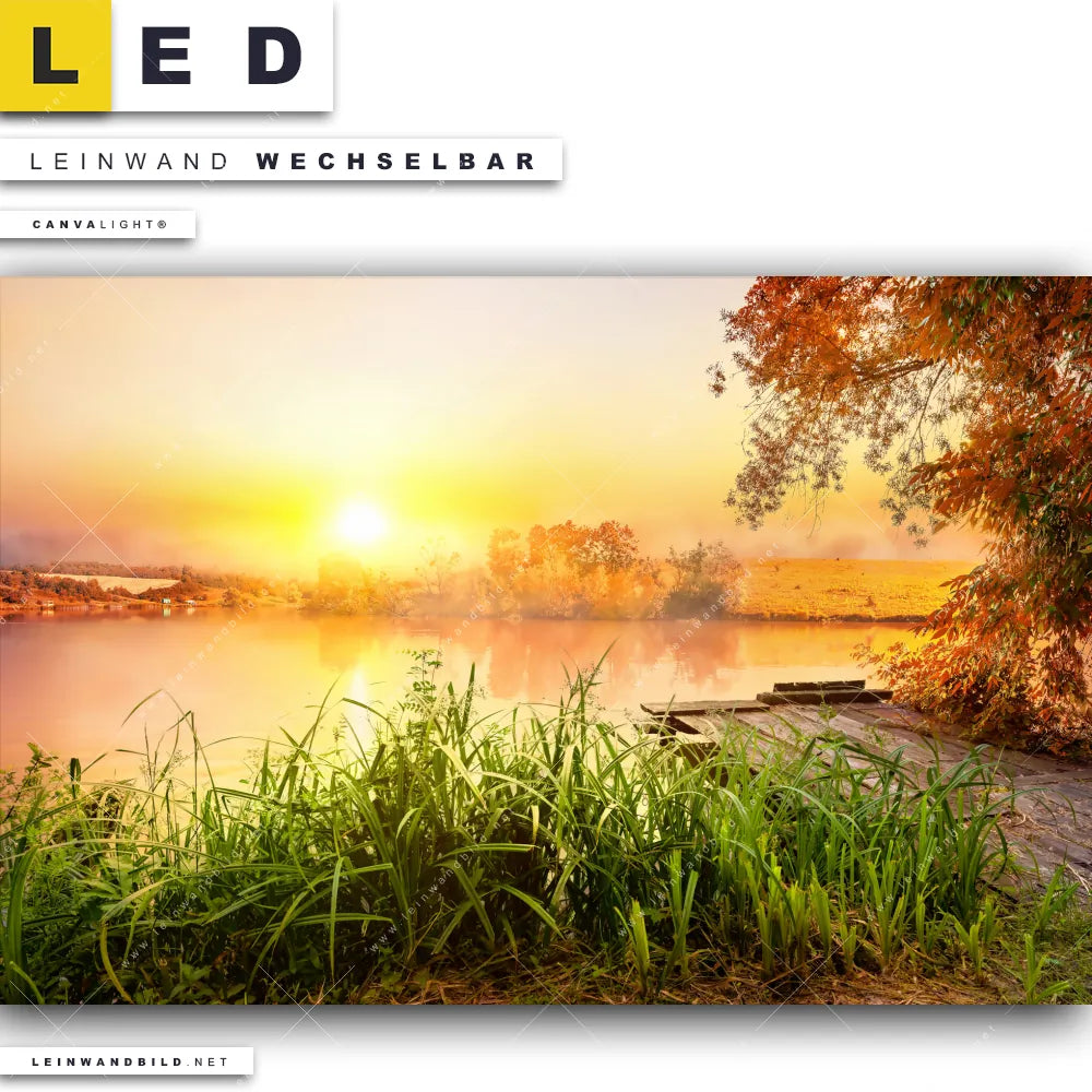 Du bist auf der Suche nach einem Landschaften LED Leinwandbild im Querformat? Begriffe wie Sonnenuntergang, Sonnenaufgang, Wasser, Fluss, Nebel, Morgenstimmung, See, Steg, Angeln, Teich, Herbst, fischen haben Dich auf der Suche nach Deinem neuen XXL LED Wandbild mit wechselbarer Leinwand inspiriert? Farben wie Braun, Grün, Orange, Ocker, Beige dürfen auf Deinem neuen breiten Leinwand-LED-Bild nicht fehlen und Leuchtbilder im Natürlich - Realistisch Stil passen perfekt zu Deinem Einrichtungsstil?