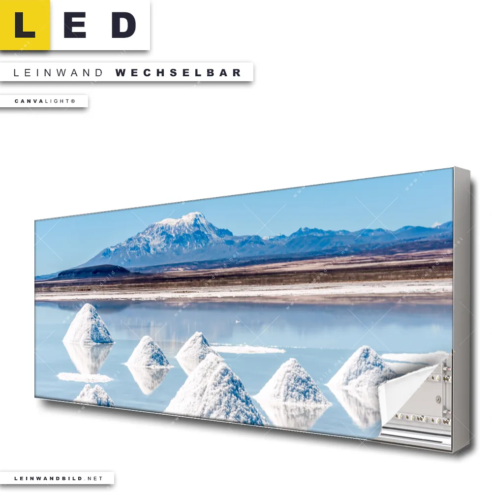 Du konfigurierst Dein individuelles LED Leinwandbild Canvalight® TEX | Salzlandschaft in den Anden | Panorama und wir produzieren es NEU für Dich. Unsere Landschaften LED Bilder mit wechselbarer Textil-Leinwand sind KEINE Lagerware. Du bist Dir unsicher, welches Motiv oder Format das richtige für dein individuelles Canvalight® Leuchtbild ist, dann helfen wir dir gerne weiter und beraten dich!