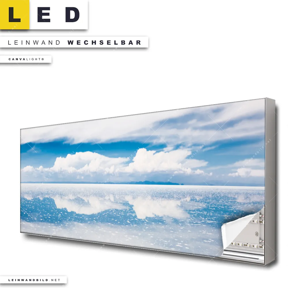 Du konfigurierst Dein individuelles LED Leinwandbild Canvalight® TEX | Salzsee in Bolivien | Panorama und wir produzieren es NEU für Dich. Unsere Landschaften LED Bilder mit wechselbarer Textil-Leinwand sind KEINE Lagerware. Du bist Dir unsicher, welches Motiv oder Format das richtige für dein individuelles Canvalight® Leuchtbild ist, dann helfen wir dir gerne weiter und beraten dich!
