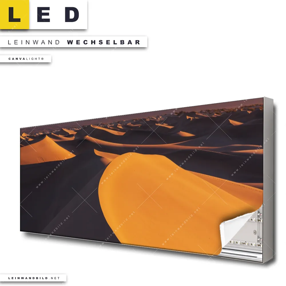 Du konfigurierst Dein individuelles LED Leinwandbild Canvalight® TEX | Sanddünen | Panorama und wir produzieren es NEU für Dich. Unsere Landschaften LED Bilder mit wechselbarer Textil-Leinwand sind KEINE Lagerware. Du bist Dir unsicher, welches Motiv oder Format das richtige für dein individuelles Canvalight® Leuchtbild ist, dann helfen wir dir gerne weiter und beraten dich!