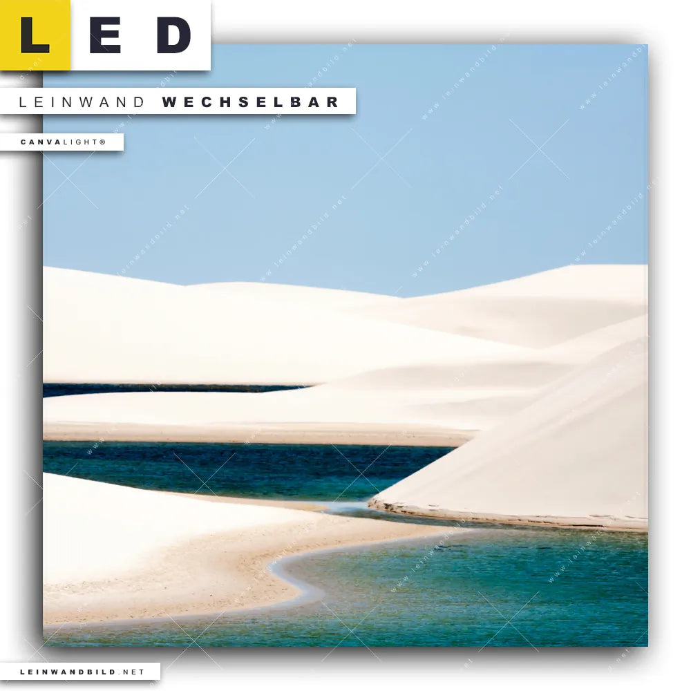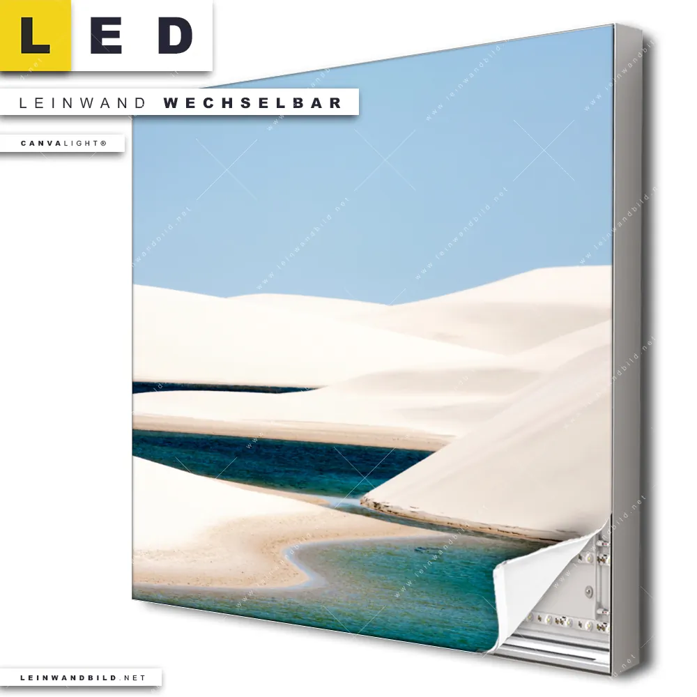 Du konfigurierst Dein individuelles LED Leinwandbild Canvalight® TEX | Sanddünen und Seen | Quadrat und wir produzieren es NEU für Dich. Unsere Landschaften LED Bilder mit wechselbarer Textil-Leinwand sind KEINE Lagerware. Du bist Dir unsicher, welches Motiv oder Format das richtige für dein individuelles Canvalight® Leuchtbild ist, dann helfen wir dir gerne weiter und beraten dich!