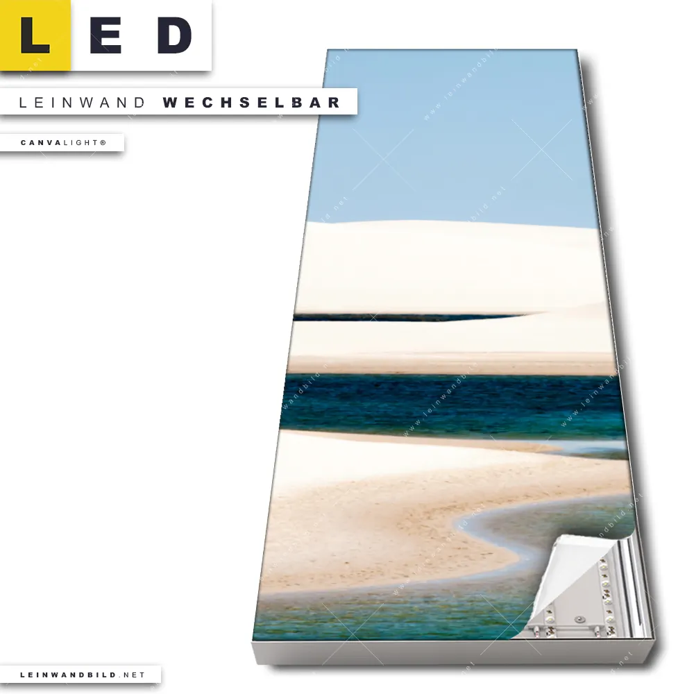 Du konfigurierst Dein individuelles LED Leinwandbild Canvalight® TEX | Sanddünen und Seen | Schmal und wir produzieren es NEU für Dich. Unsere Landschaften LED Bilder mit wechselbarer Textil-Leinwand sind KEINE Lagerware. Du bist Dir unsicher, welches Motiv oder Format das richtige für dein individuelles Canvalight® Leuchtbild ist, dann helfen wir dir gerne weiter und beraten dich!
