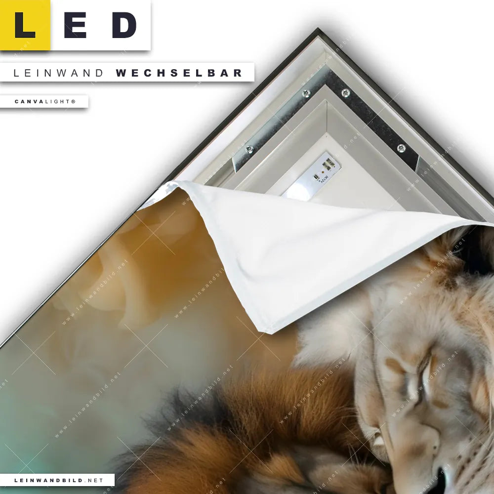 Du konfigurierst Dein individuelles LED Leinwandbild Canvalight® TEX | Sanfte Löwenmomente in buntem Nebel | Hochformat und wir produzieren es NEU für Dich. Unsere Tierwelt LED Bilder mit wechselbarer Textil-Leinwand sind KEINE Lagerware. Du bist Dir unsicher, welches Motiv oder Format das richtige für dein individuelles Canvalight® Leuchtbild ist, dann helfen wir dir gerne weiter und beraten dich!
