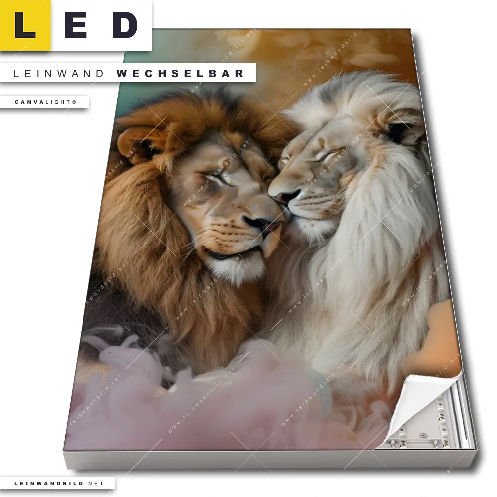 Dann sollte das LED Leinwandbild Canvalight® TEX | Sanfte Löwenmomente in buntem Nebel | Hochformat den Weg zu Dir finden. Das stufenlos dimmbare Leinwandbild Wildkatzen Zweisamkeit im steckerfertigen Leuchtrahmen mit Fernbedienung und optionaler Farbtemperatursteuerung fügt sich als Eye-Catcher harmonisch in jedes Wohnzimmer - Schlafzimmer, Büro - Kanzlei, Flur - Eingangsbereich Raumkonzept ein.