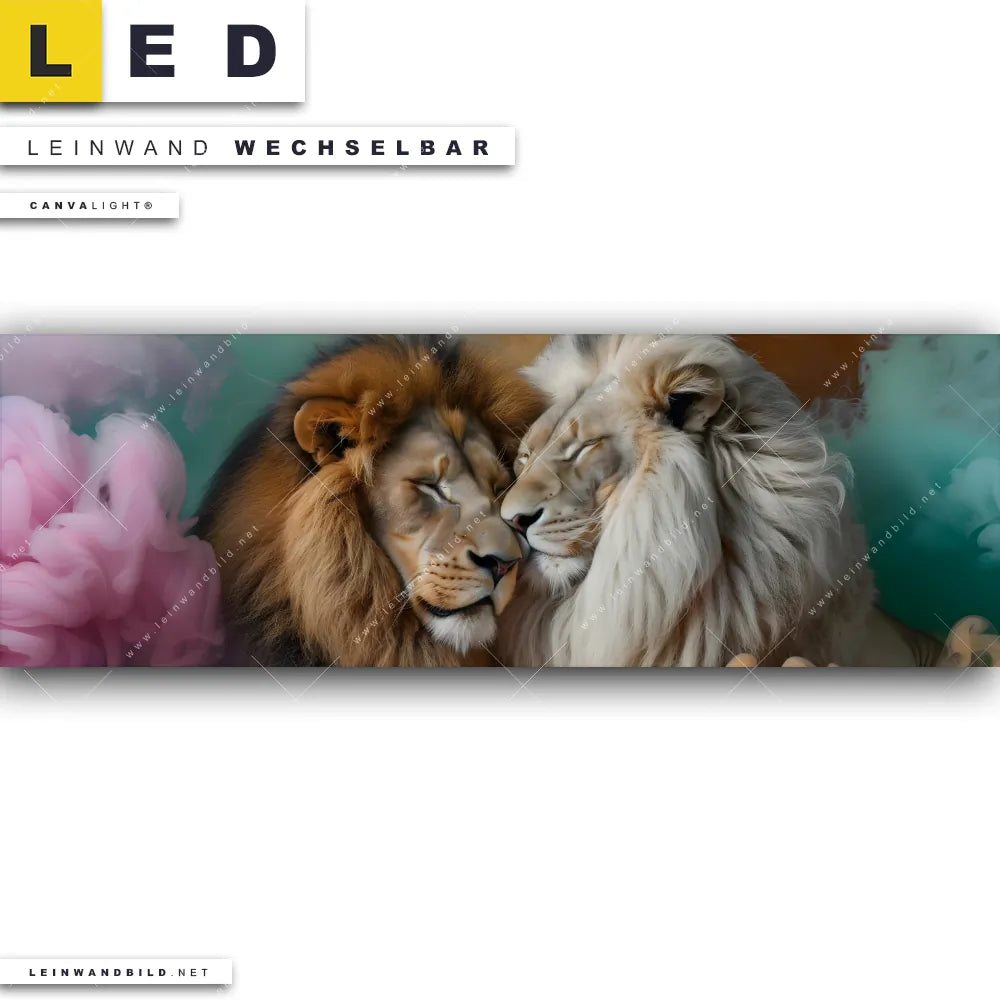 LED Leinwandbild Canvalight® TEX | Sanfte Löwenmomente in buntem Nebel | Panorama