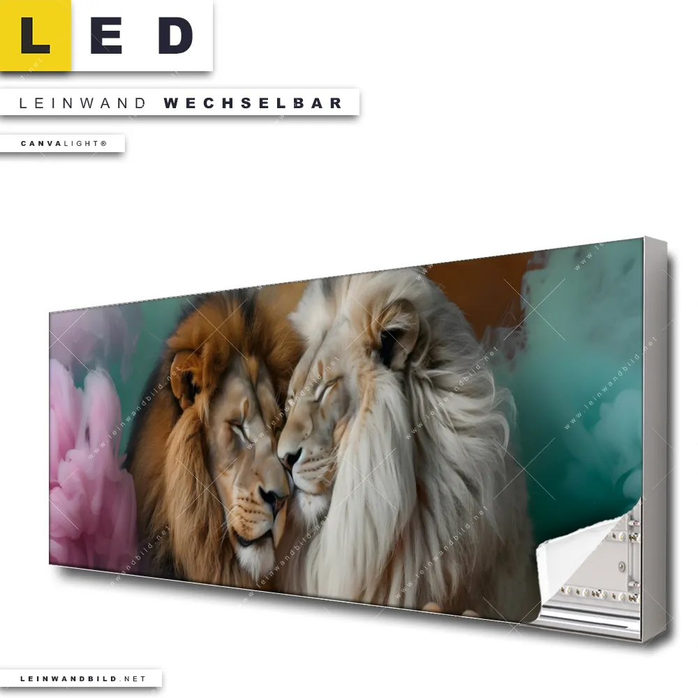 Dann sollte das LED Leinwandbild Canvalight® TEX | Sanfte Löwenmomente in buntem Nebel | Panorama den Weg zu Dir finden. Das stufenlos dimmbare Leinwandbild Romantische Raubkatzen im steckerfertigen Leuchtrahmen mit Fernbedienung und optionaler Farbtemperatursteuerung fügt sich als Eye-Catcher harmonisch in jedes Wohnzimmer - Schlafzimmer, Büro - Kanzlei, Flur - Eingangsbereich Raumkonzept ein.