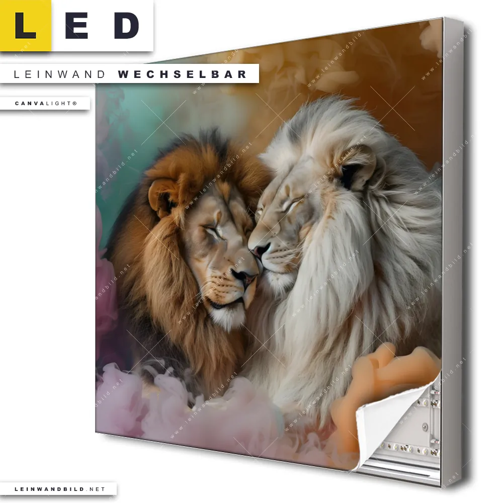 LED Leinwandbild Canvalight® TEX | Sanfte Löwenmomente in buntem Nebel | Quadrat