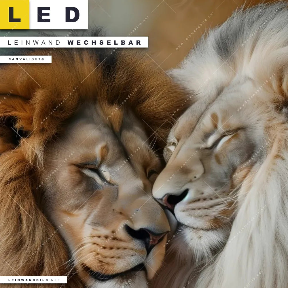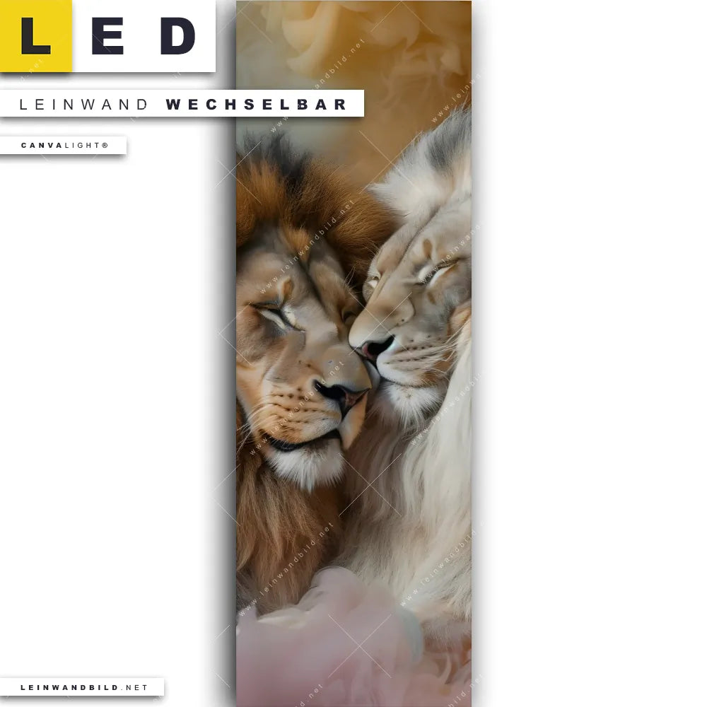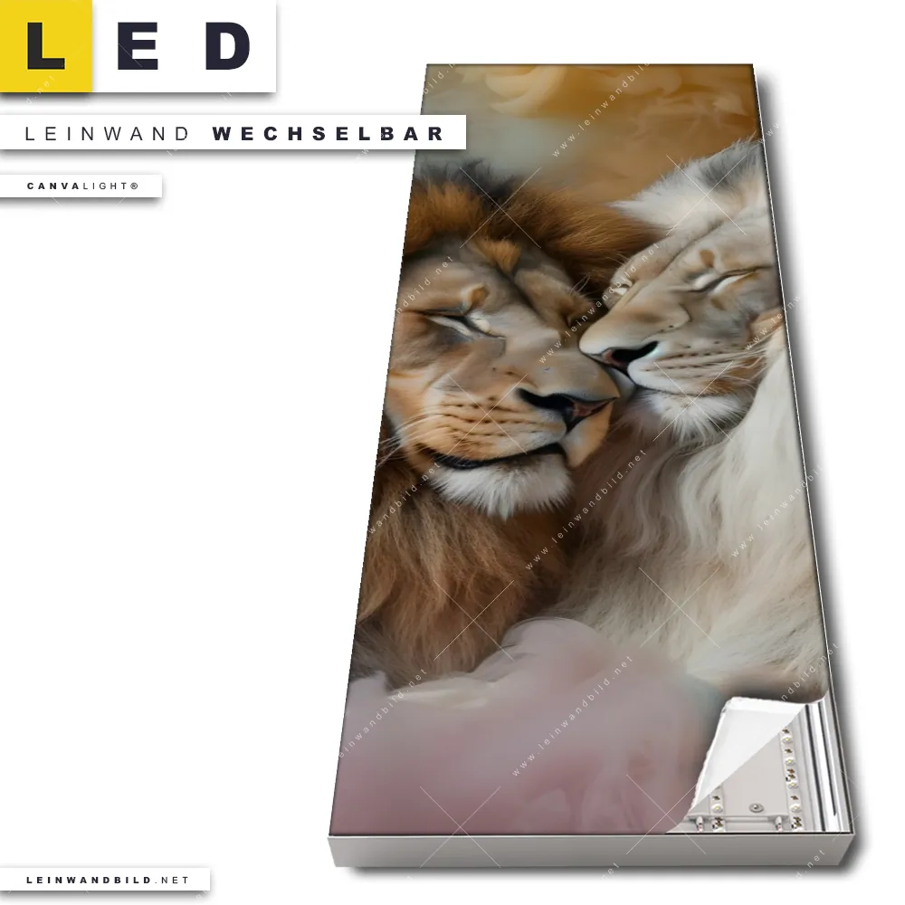 LED Leinwandbild Canvalight® TEX | Sanfte Löwenmomente in buntem Nebel | Schmal