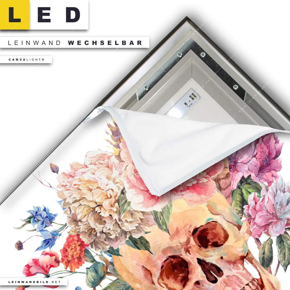 Du konfigurierst Dein individuelles LED Leinwandbild Canvalight® TEX | Schädel im Boho Stil | Quadrat und wir produzieren es NEU für Dich. Unsere Blumen - Botanik, Porträts - Menschen LED Bilder mit wechselbarer Textil-Leinwand sind KEINE Lagerware. Du bist Dir unsicher, welches Motiv oder Format das richtige für dein individuelles Canvalight® Leuchtbild ist, dann helfen wir dir gerne weiter und beraten dich!