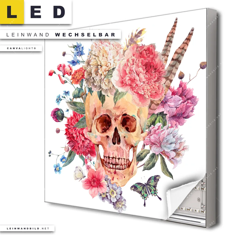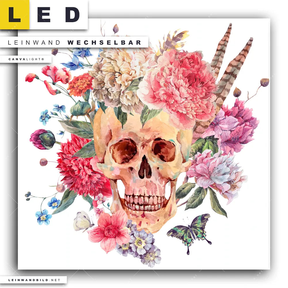 Du bist auf der Suche nach einem Blumen - Botanik, Porträts - Menschen LED Leinwandbild im Quadratischen Format? Begriffe wie Schädel, Totenkopf, Skelett, Skull, Knochen, Totenköpfe, Blumen, Blüten, Blätter, Federn, Schmetterling haben Dich auf der Suche nach Deinem neuen XXL LED Wandbild mit wechselbarer Leinwand inspiriert? Farben wie Rot, Pink, Rosa, Weiss dürfen auf Deinem neuen Leinwand-LED-Bild nicht fehlen und Leuchtbilder im Mixed Media, Floral Stil passen perfekt zu Deinem Einrichtungsstil?