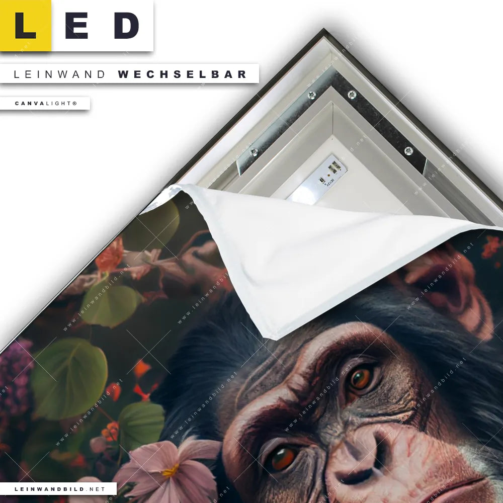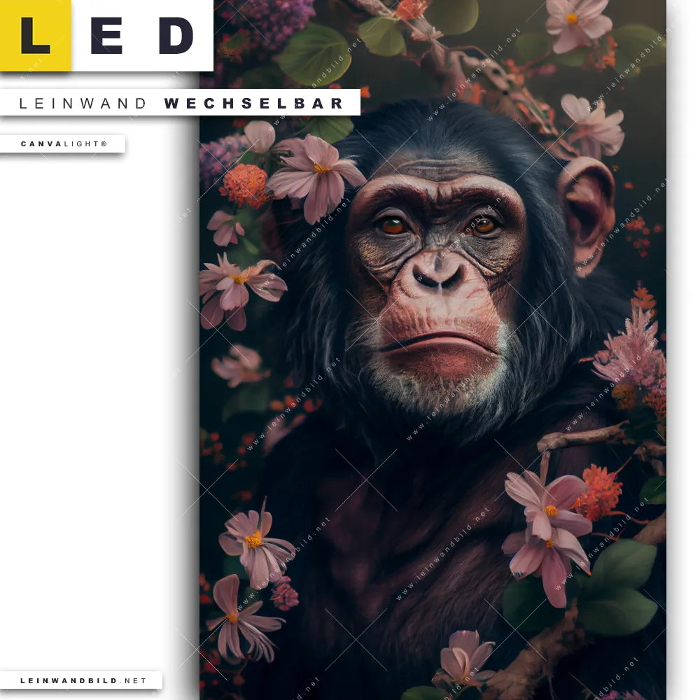 LED Leinwandbild Canvalight® TEX | Schimpanse zwischen Blumen | Hochformat