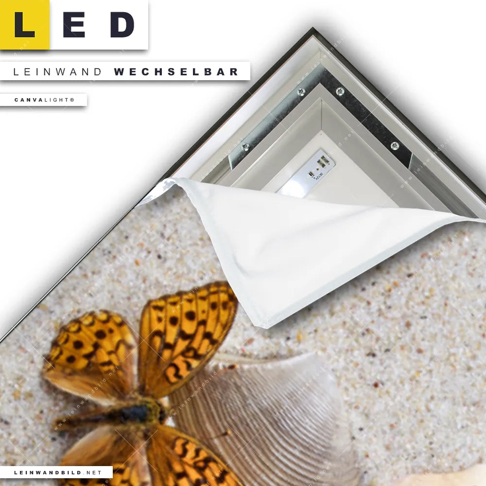 Du konfigurierst Dein individuelles LED Leinwandbild Canvalight® TEX | Schmetterlinge & Muscheln im Sand | Schmal und wir produzieren es NEU für Dich. Unsere Tierwelt, Strand - Meer LED Bilder mit wechselbarer Textil-Leinwand sind KEINE Lagerware. Du bist Dir unsicher, welches Motiv oder Format das richtige für dein individuelles Canvalight® Leuchtbild ist, dann helfen wir dir gerne weiter und beraten dich!