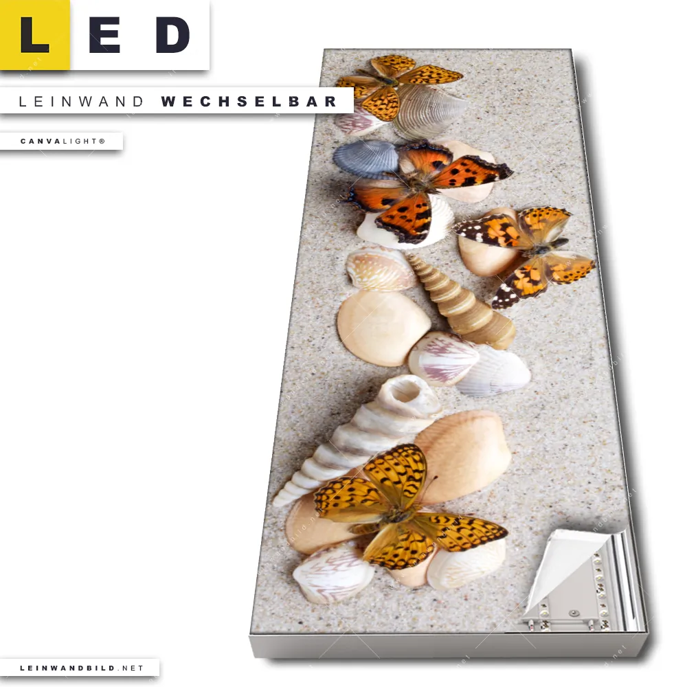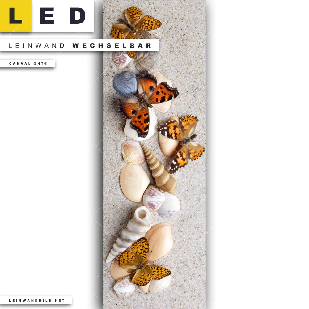 LED Leinwandbild Canvalight® TEX | Schmetterlinge & Muscheln im Sand | Schmal