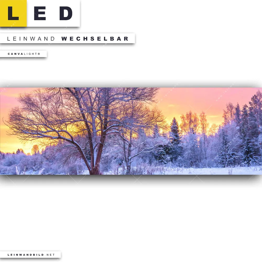 Du bist auf der Suche nach einem Landschaften, Winter, Wald - Bäume LED Leinwandbild im Panorama-Format? Begriffe wie Schneelandschaft, Winter, Schnee, Sonnenaufgang, Weihnachten, Wald haben Dich auf der Suche nach Deinem neuen XXL LED Wandbild mit wechselbarer Leinwand inspiriert? Farben wie Weiss, Orange, Lila, Pink dürfen auf Deinem neuen extra breiten Leinwand-LED-Bild nicht fehlen und Leuchtbilder im Natürlich - Realistisch Stil passen perfekt zu Deinem Einrichtungsstil?