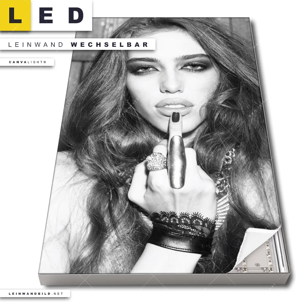 Dann sollte das LED Leinwandbild Canvalight® TEX | Schöner Mittelfinger | Hochformat den Weg zu Dir finden. Das stufenlos dimmbare Leinwandbild selbstbewusste Frau im steckerfertigen Leuchtrahmen mit Fernbedienung und optionaler Farbtemperatursteuerung fügt sich als Eye-Catcher harmonisch in jedes Bar - Gastronomie, Friseur - Beauty, Wohnzimmer - Schlafzimmer Raumkonzept ein.