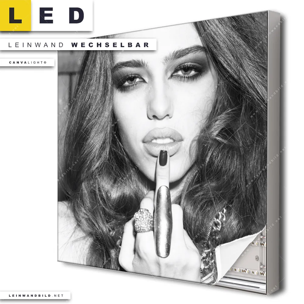 Du bist auf der Suche nach einem Porträts - Menschen LED Leinwandbild im Quadratischen Format? Begriffe wie Frau, Lippen, Mund, Porträt, modern, Beauty, Schönheit, Mädchen, Finger, Mittelfinger, Stinkefinger haben Dich auf der Suche nach Deinem neuen XXL LED Wandbild mit wechselbarer Leinwand inspiriert? Farben wie Schwarz, Weiss dürfen auf Deinem neuen Leinwand-LED-Bild nicht fehlen und Leuchtbilder im Modern Art, Schwarz - Weiss Stil passen perfekt zu Deinem Einrichtungsstil?