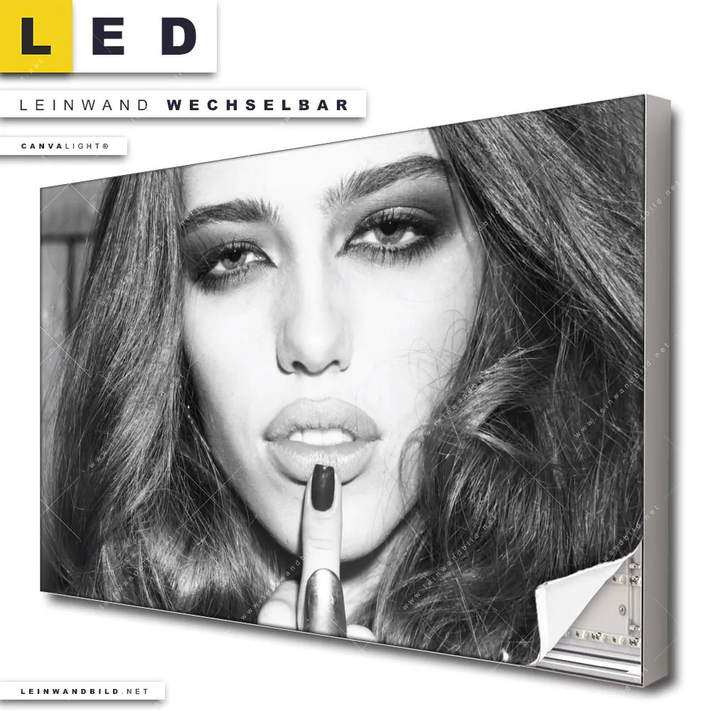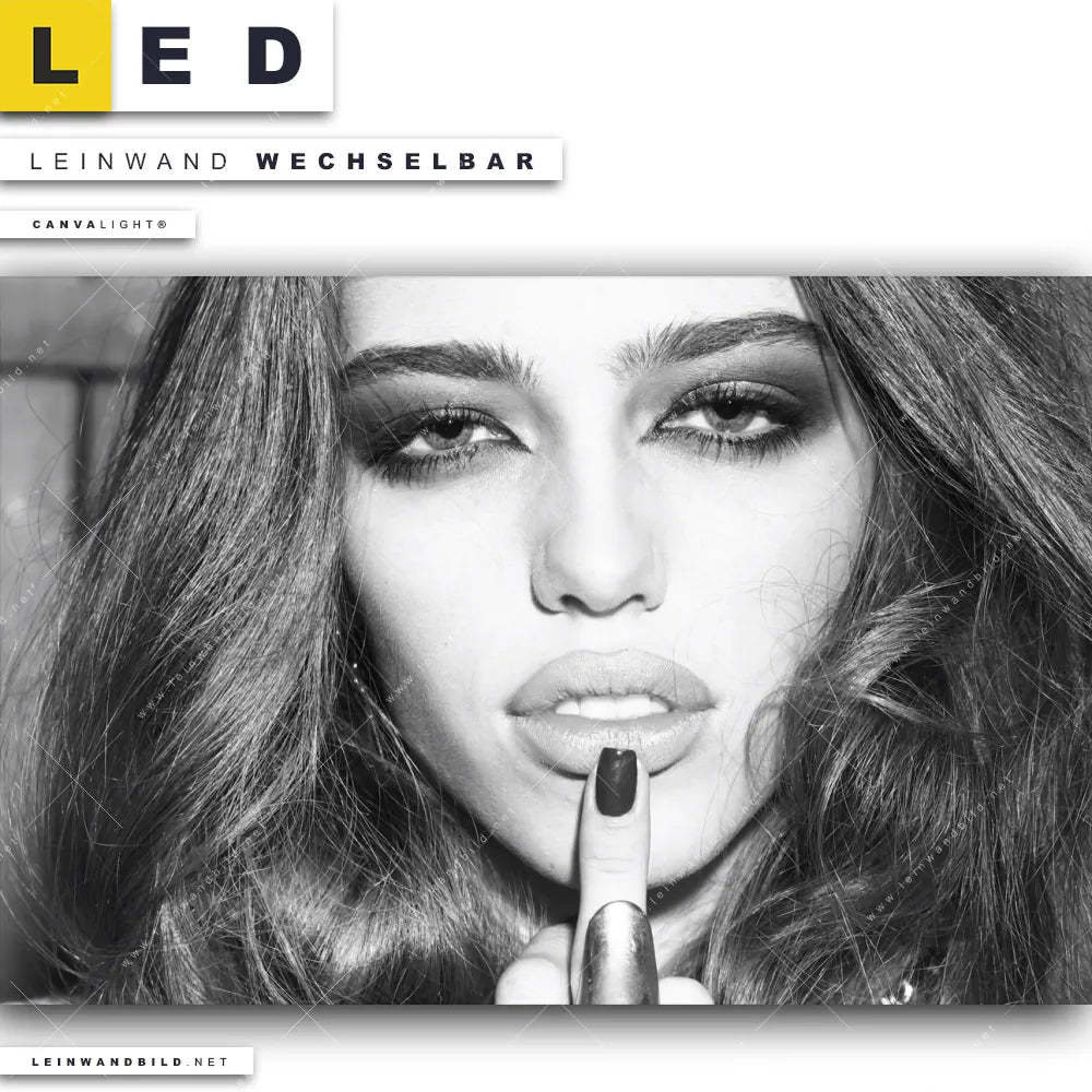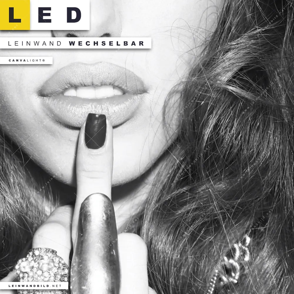 Du bist auf der Suche nach einem Porträts - Menschen LED Leinwandbild im Querformat? Begriffe wie Frau, Lippen, Mund, Porträt, modern, Beauty, Schönheit, Mädchen, Finger, Mittelfinger, Stinkefinger haben Dich auf der Suche nach Deinem neuen XXL LED Wandbild mit wechselbarer Leinwand inspiriert? Farben wie Schwarz, Weiss dürfen auf Deinem neuen breiten Leinwand-LED-Bild nicht fehlen und Leuchtbilder im Modern Art, Schwarz - Weiss Stil passen perfekt zu Deinem Einrichtungsstil?