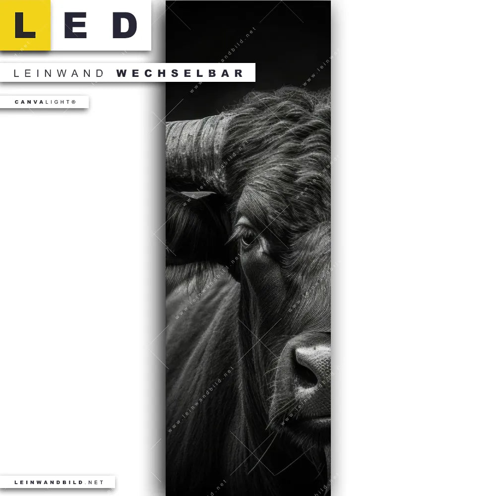 Du bist auf der Suche nach einem Tierwelt LED Leinwandbild im Schmalen Format? Begriffe wie Hochlandrind, Rind, Stier, Hörner, Porträt haben Dich auf der Suche nach Deinem neuen XXL LED Wandbild mit wechselbarer Leinwand inspiriert? Farben wie Schwarz, Grau dürfen auf Deinem neuen Leinwand-LED-Bild im Panorama-Hochformat nicht fehlen und Leuchtbilder im Schwarz - Weiss, Minimalistisch Stil passen perfekt zu Deinem Einrichtungsstil?