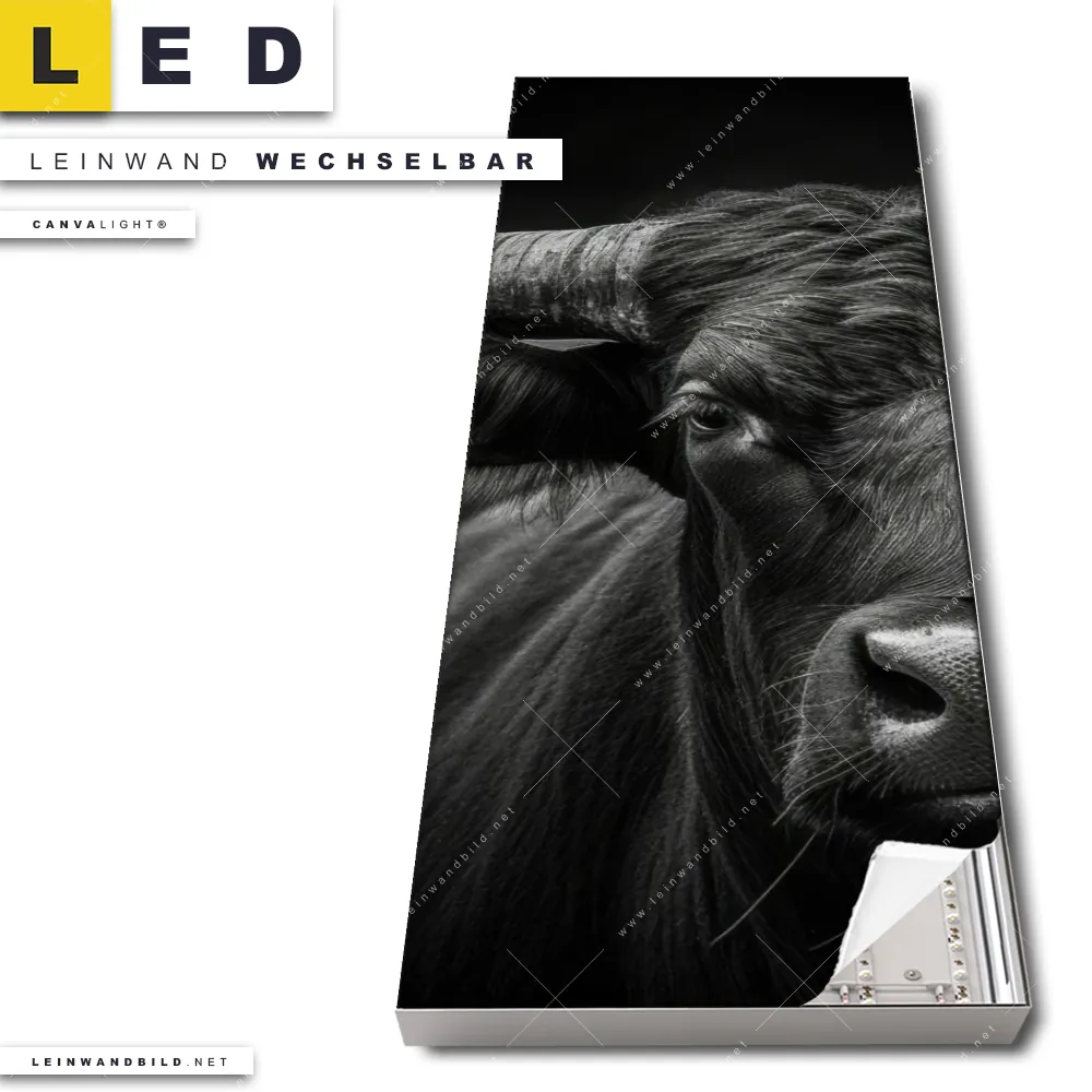 Du konfigurierst Dein individuelles LED Leinwandbild Canvalight® TEX | Schwarzer Bulle | Schmal und wir produzieren es NEU für Dich. Unsere Tierwelt LED Bilder mit wechselbarer Textil-Leinwand sind KEINE Lagerware. Du bist Dir unsicher, welches Motiv oder Format das richtige für dein individuelles Canvalight® Leuchtbild ist, dann helfen wir dir gerne weiter und beraten dich!