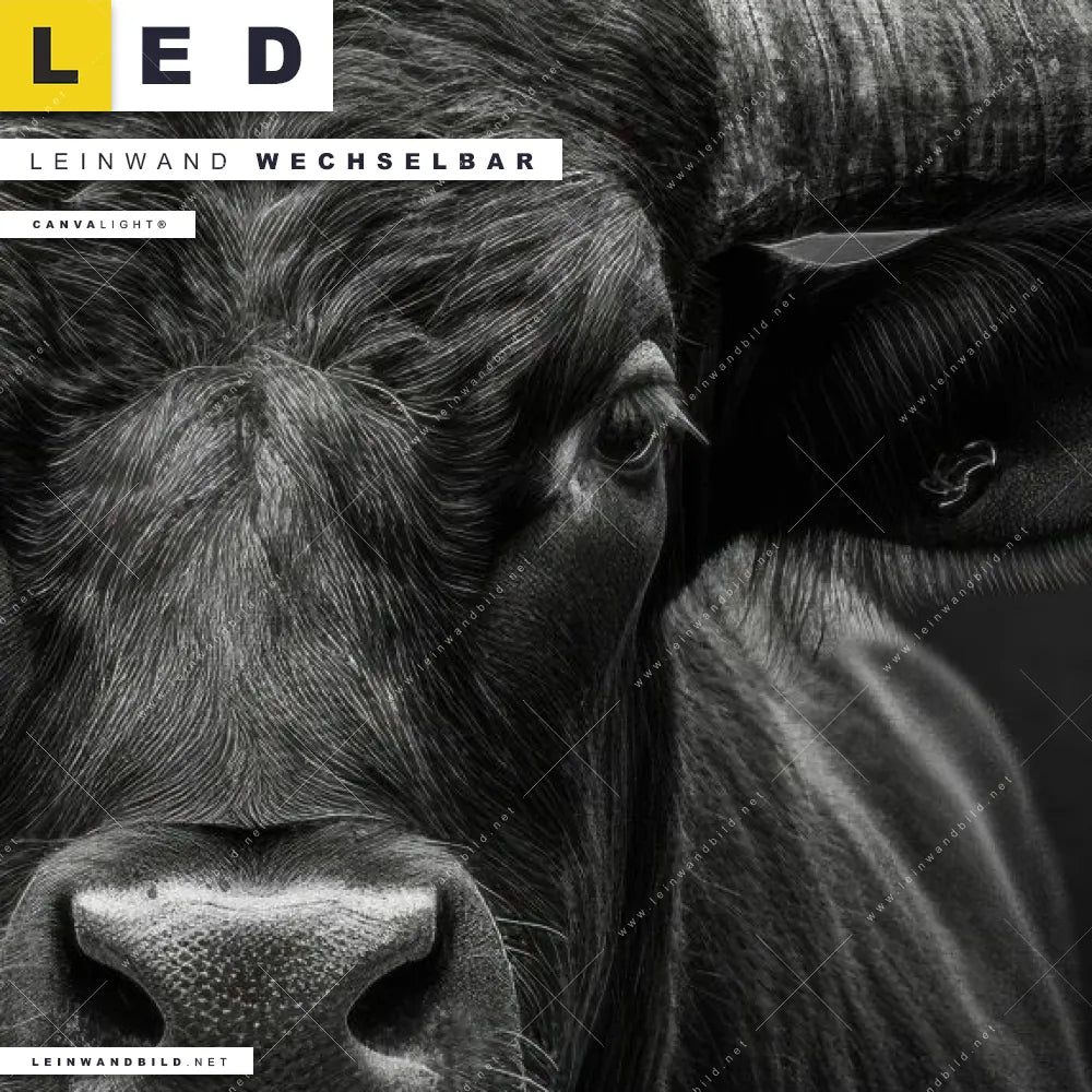 Dann sollte das LED Leinwandbild Canvalight® TEX | Schwarzer Bulle | Schmal den Weg zu Dir finden. Das stufenlos dimmbare Leinwandbild Rinderbulle im steckerfertigen Leuchtrahmen mit Fernbedienung und optionaler Farbtemperatursteuerung fügt sich als Eye-Catcher harmonisch in jedes Büro - Kanzlei, Wohnzimmer - Schlafzimmer Raumkonzept ein.