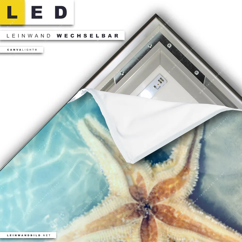 Du konfigurierst Dein individuelles LED Leinwandbild Canvalight® TEX | Seesterne & Muscheln | Schmal und wir produzieren es NEU für Dich. Unsere Strand - Meer LED Bilder mit wechselbarer Textil-Leinwand sind KEINE Lagerware. Du bist Dir unsicher, welches Motiv oder Format das richtige für dein individuelles Canvalight® Leuchtbild ist, dann helfen wir dir gerne weiter und beraten dich!