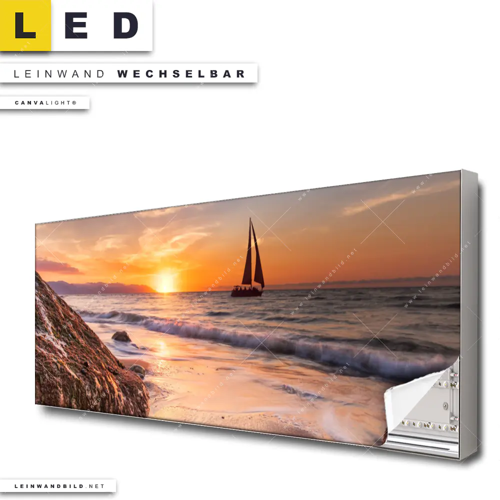 Du konfigurierst Dein individuelles LED Leinwandbild Canvalight® TEX | Segelboot im Sonnenuntergang | Panorama und wir produzieren es NEU für Dich. Unsere Landschaften, Strand - Meer LED Bilder mit wechselbarer Textil-Leinwand sind KEINE Lagerware. Du bist Dir unsicher, welches Motiv oder Format das richtige für dein individuelles Canvalight® Leuchtbild ist, dann helfen wir dir gerne weiter und beraten dich!