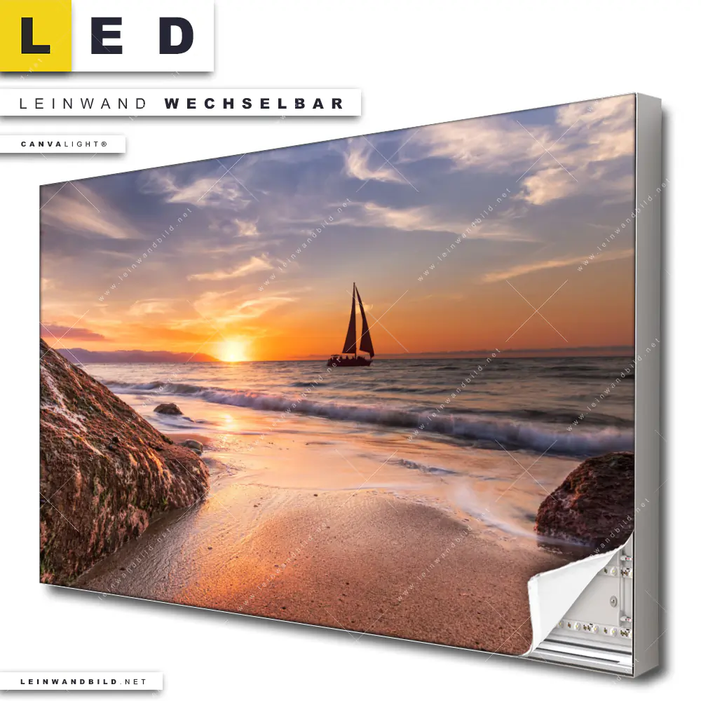 Du konfigurierst Dein individuelles LED Leinwandbild Canvalight® TEX | Segelboot im Sonnenuntergang | Querformat und wir produzieren es NEU für Dich. Unsere Landschaften, Strand - Meer LED Bilder mit wechselbarer Textil-Leinwand sind KEINE Lagerware. Du bist Dir unsicher, welches Motiv oder Format das richtige für dein individuelles Canvalight® Leuchtbild ist, dann helfen wir dir gerne weiter und beraten dich!