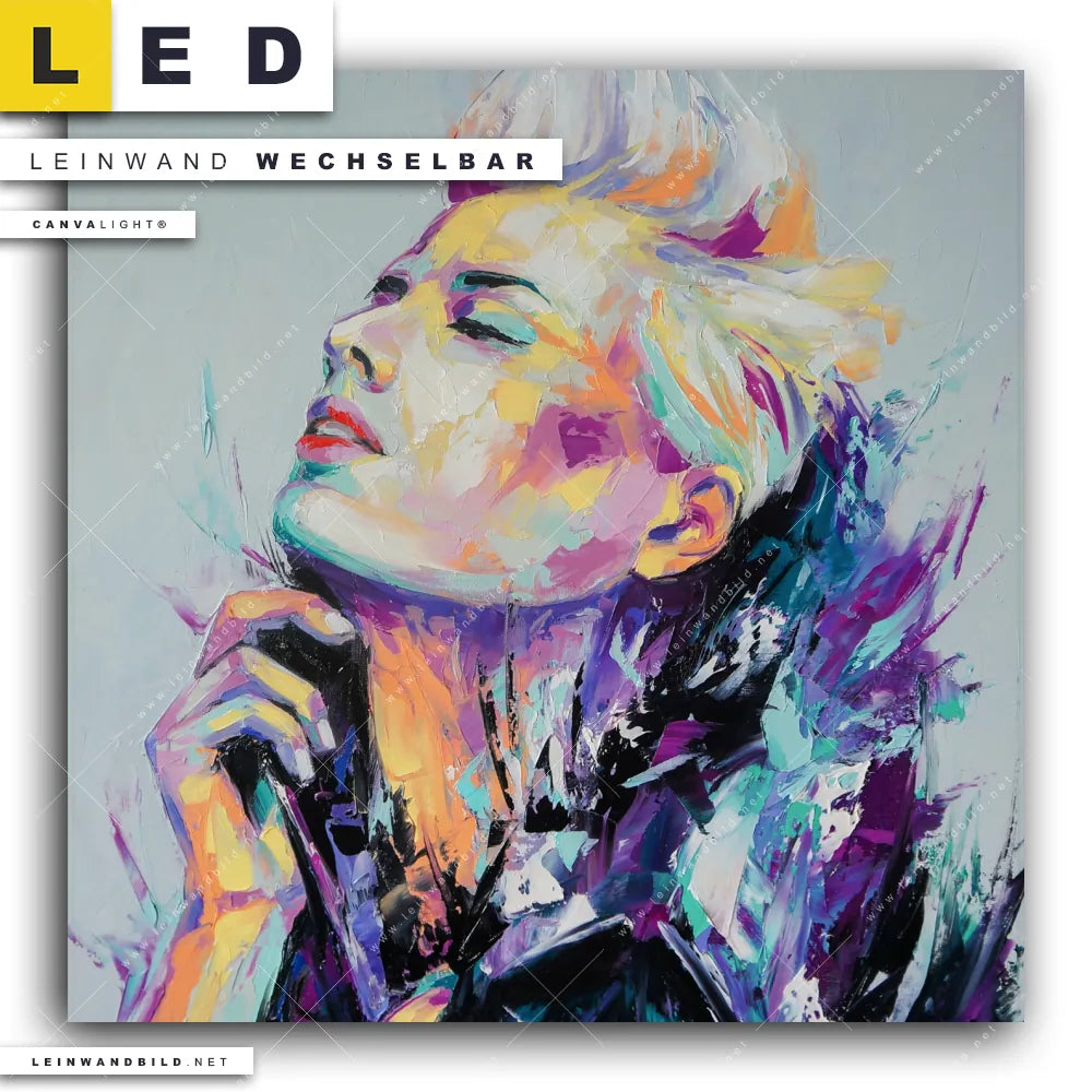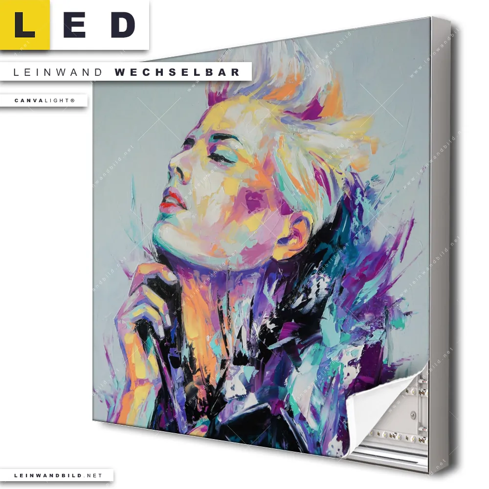 Dann sollte das LED Leinwandbild Canvalight® TEX | Sinnliche Schönheit | Quadrat den Weg zu Dir finden. Das stufenlos dimmbare Leinwandbild buntes Porträt einer Frau im steckerfertigen Leuchtrahmen mit Fernbedienung und optionaler Farbtemperatursteuerung fügt sich als Eye-Catcher harmonisch in jedes Wohnzimmer - Schlafzimmer, Bar - Gastronomie, Friseur - Beauty Raumkonzept ein.