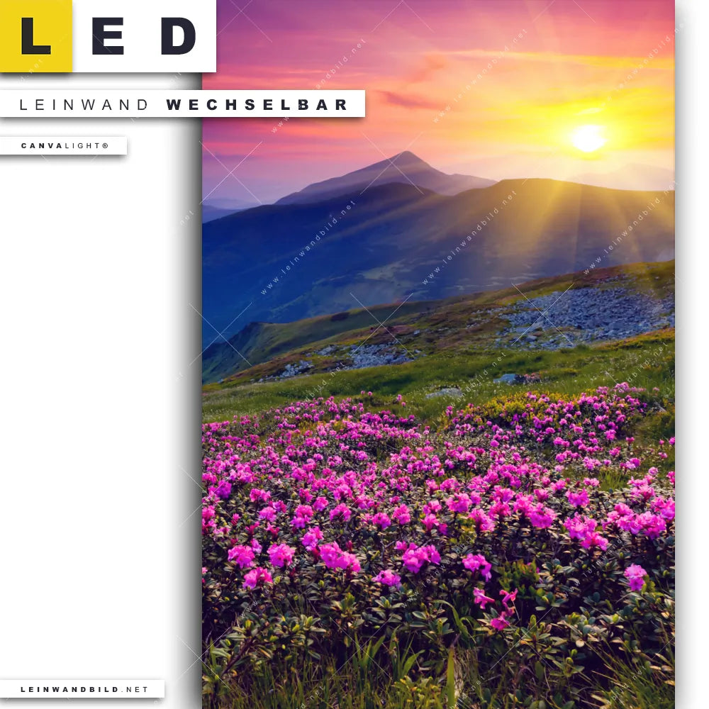 Du bist auf der Suche nach einem Landschaften LED Leinwandbild im Hochformat? Begriffe wie Berge, Sonnenuntergang, Bergwiese, Sommer, Blumen, Blumenwiese haben Dich auf der Suche nach Deinem neuen XXL LED Wandbild mit wechselbarer Leinwand inspiriert? Farben wie Blau, Bunt, Grün, Hellblau, Hellgrün, Lila, Orange, Pink, Rot, Rosa dürfen auf Deinem neuen Leinwand-LED-Bild nicht fehlen und Leuchtbilder im Natürlich - Realistisch Stil passen perfekt zu Deinem Einrichtungsstil?