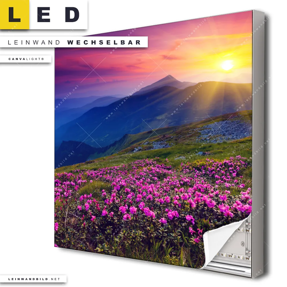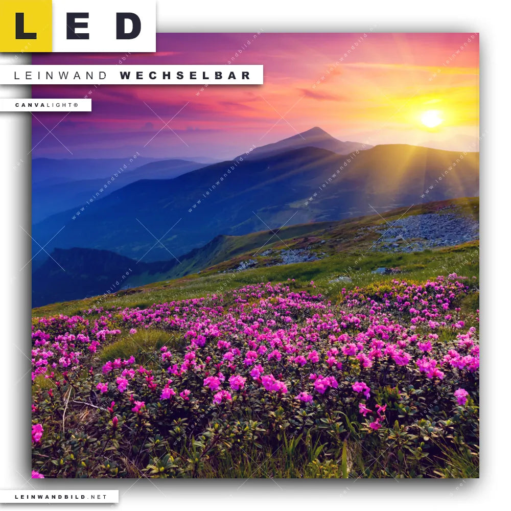 Du bist auf der Suche nach einem Landschaften LED Leinwandbild im Quadratischen Format? Begriffe wie Berge, Sonnenuntergang, Bergwiese, Sommer, Blumen, Blumenwiese haben Dich auf der Suche nach Deinem neuen XXL LED Wandbild mit wechselbarer Leinwand inspiriert? Farben wie Blau, Bunt, Grün, Hellblau, Hellgrün, Lila, Orange, Pink, Rot, Rosa dürfen auf Deinem neuen Leinwand-LED-Bild nicht fehlen und Leuchtbilder im Natürlich - Realistisch Stil passen perfekt zu Deinem Einrichtungsstil?