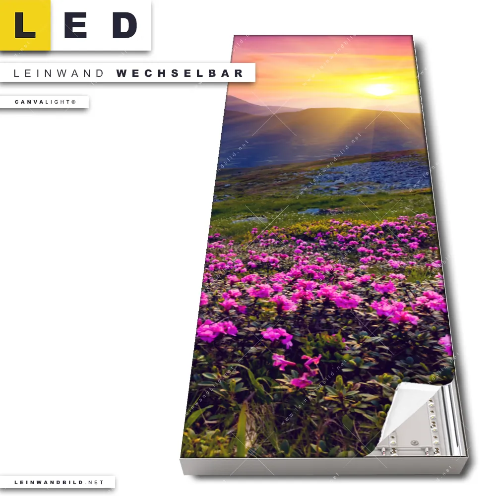 Du bist auf der Suche nach einem Landschaften LED Leinwandbild im Schmalen Format? Begriffe wie Berge, Sonnenuntergang, Bergwiese, Sommer, Blumen, Blumenwiese haben Dich auf der Suche nach Deinem neuen XXL LED Wandbild mit wechselbarer Leinwand inspiriert? Farben wie Blau, Bunt, Grün, Hellblau, Hellgrün, Lila, Orange, Pink, Rot, Rosa dürfen auf Deinem neuen Leinwand-LED-Bild im Panorama-Hochformat nicht fehlen und Leuchtbilder im Natürlich - Realistisch Stil passen perfekt zu Deinem Einrichtungsstil?