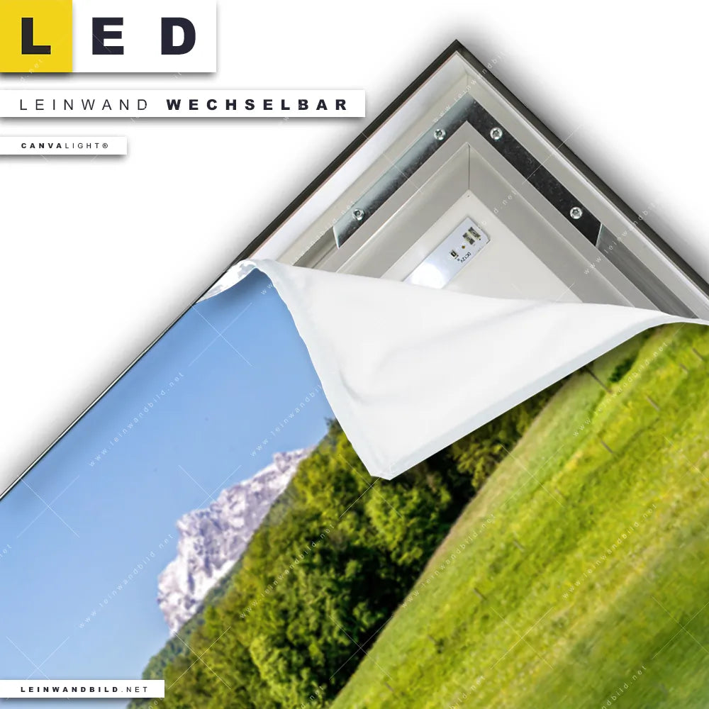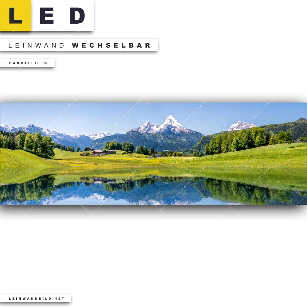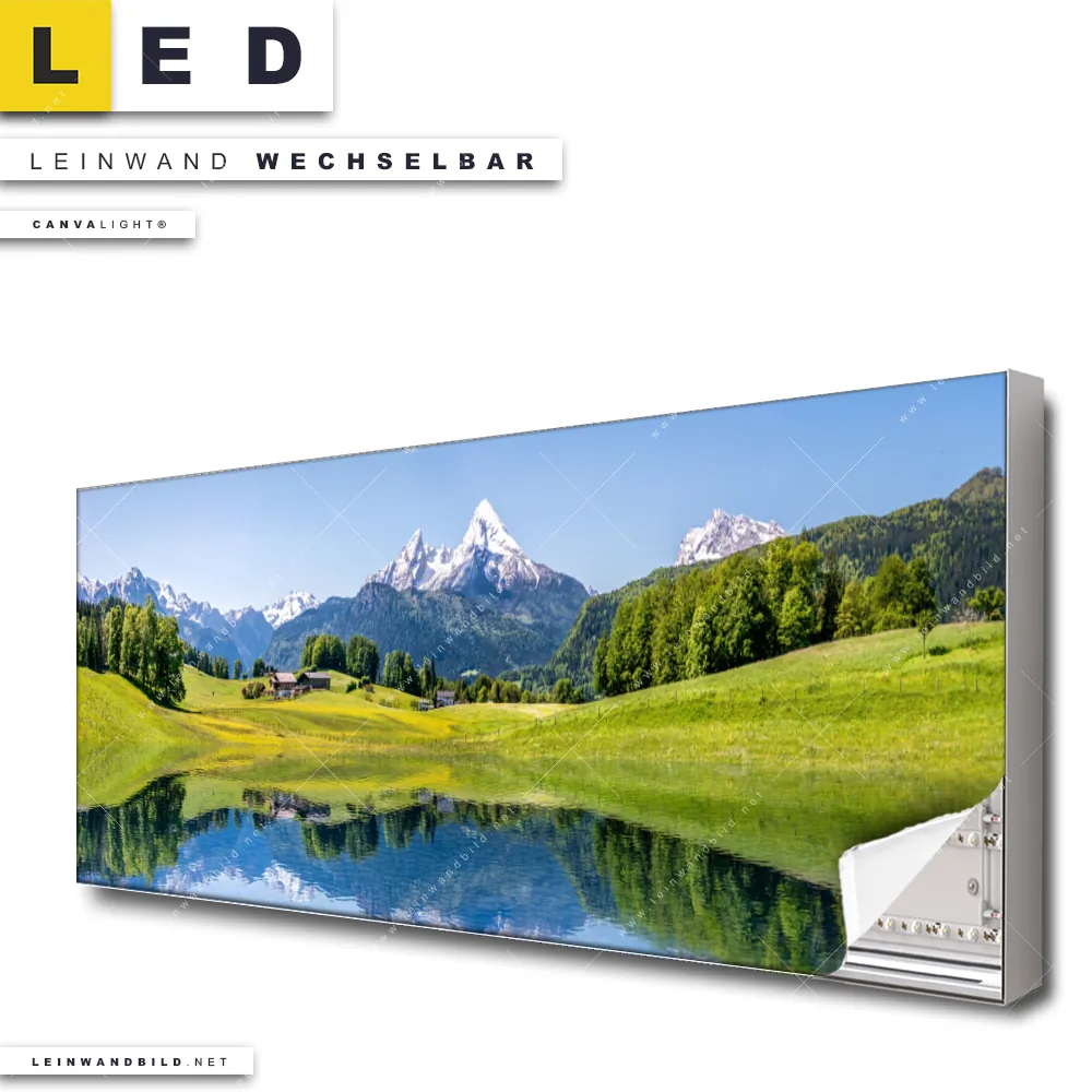 Du konfigurierst Dein individuelles LED Leinwandbild Canvalight® TEX | Sommerlandschaft in den Alpen | Panorama und wir produzieren es NEU für Dich. Unsere Landschaften LED Bilder mit wechselbarer Textil-Leinwand sind KEINE Lagerware. Du bist Dir unsicher, welches Motiv oder Format das richtige für dein individuelles Canvalight® Leuchtbild ist, dann helfen wir dir gerne weiter und beraten dich!