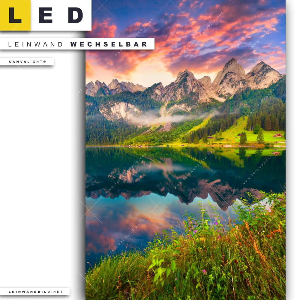 Du bist auf der Suche nach einem Landschaften LED Leinwandbild im Hochformat? Begriffe wie Urlaub, Reisen, Berge, Bergsee, See, Wasserspiegelung, Sonne, Sonnenstrahlen, Wasser, Sonnenuntergang, Sonnenaufgang, Wiese, Natur haben Dich auf der Suche nach Deinem neuen XXL LED Wandbild mit wechselbarer Leinwand inspiriert? Farben wie Bunt dürfen auf Deinem neuen Leinwand-LED-Bild nicht fehlen und Leuchtbilder im Natürlich - Realistisch Stil passen perfekt zu Deinem Einrichtungsstil?