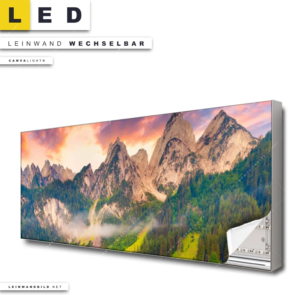 Du konfigurierst Dein individuelles LED Leinwandbild Canvalight® TEX | Sonnenaufgang am Bergsee | Panorama und wir produzieren es NEU für Dich. Unsere Landschaften LED Bilder mit wechselbarer Textil-Leinwand sind KEINE Lagerware. Du bist Dir unsicher, welches Motiv oder Format das richtige für dein individuelles Canvalight® Leuchtbild ist, dann helfen wir dir gerne weiter und beraten dich!