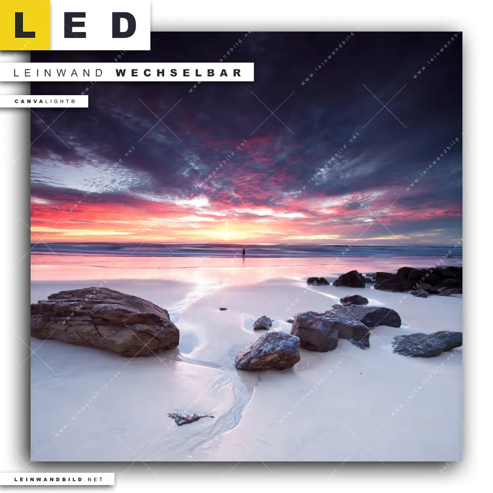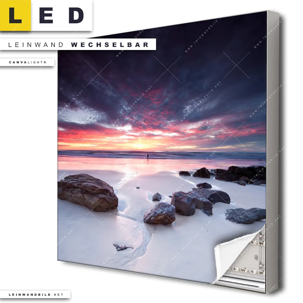 Du konfigurierst Dein individuelles LED Leinwandbild Canvalight® TEX | Sonnenaufgang am Strand mit Felsen | Quadrat und wir produzieren es NEU für Dich. Unsere Landschaften, Strand - Meer LED Bilder mit wechselbarer Textil-Leinwand sind KEINE Lagerware. Du bist Dir unsicher, welches Motiv oder Format das richtige für dein individuelles Canvalight® Leuchtbild ist, dann helfen wir dir gerne weiter und beraten dich!