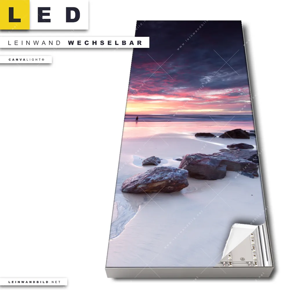 Du konfigurierst Dein individuelles LED Leinwandbild Canvalight® TEX | Sonnenaufgang am Strand mit Felsen | Schmal und wir produzieren es NEU für Dich. Unsere Landschaften, Strand - Meer LED Bilder mit wechselbarer Textil-Leinwand sind KEINE Lagerware. Du bist Dir unsicher, welches Motiv oder Format das richtige für dein individuelles Canvalight® Leuchtbild ist, dann helfen wir dir gerne weiter und beraten dich!