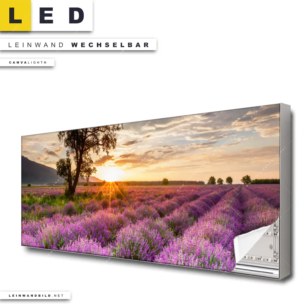 Du bist auf der Suche nach einem Landschaften LED Leinwandbild im Panorama-Format? Begriffe wie Blumen, Baum, Feld, Sonnenuntergang, Wiese, Himmel, Sonnenaufgang, Lavendel, Natur haben Dich auf der Suche nach Deinem neuen XXL LED Wandbild mit wechselbarer Leinwand inspiriert? Farben wie Lila, Orange, Grau , Braun dürfen auf Deinem neuen extra breiten Leinwand-LED-Bild nicht fehlen und Leuchtbilder im Natürlich - Realistisch, Floral Stil passen perfekt zu Deinem Einrichtungsstil?