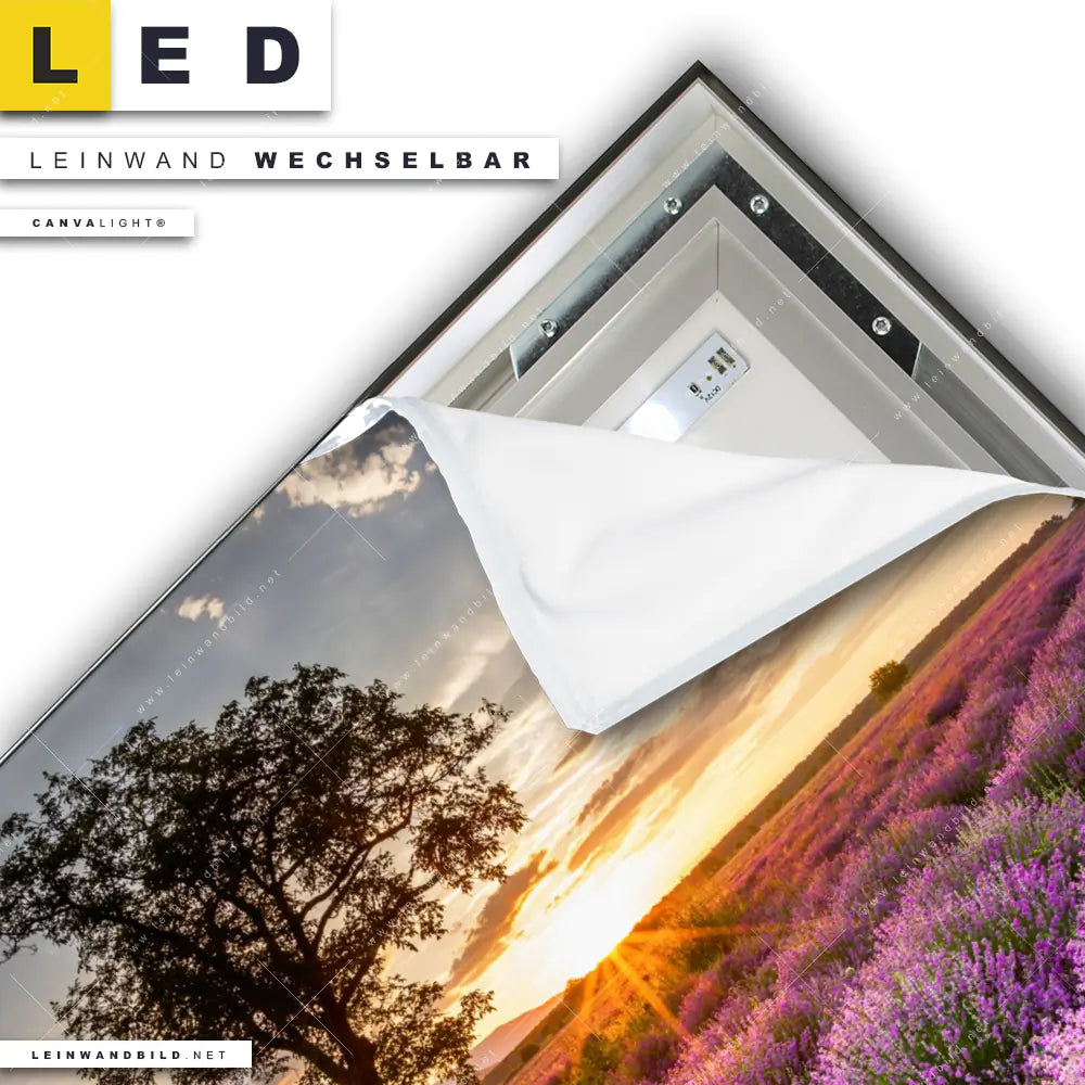 Du konfigurierst Dein individuelles LED Leinwandbild Canvalight® TEX | Sonnenaufgang im Lavendelfeld | Quadrat und wir produzieren es NEU für Dich. Unsere Landschaften LED Bilder mit wechselbarer Textil-Leinwand sind KEINE Lagerware. Du bist Dir unsicher, welches Motiv oder Format das richtige für dein individuelles Canvalight® Leuchtbild ist, dann helfen wir dir gerne weiter und beraten dich!