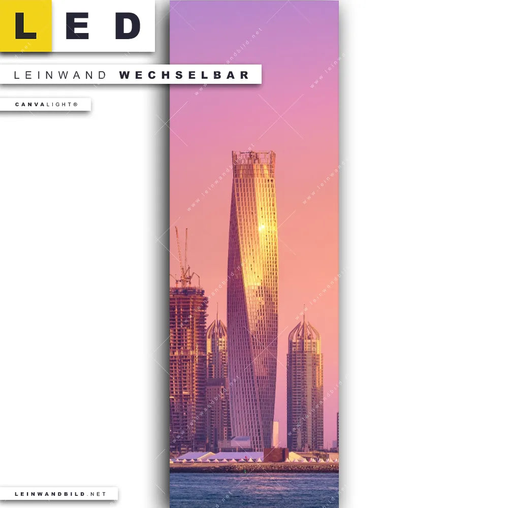 Du bist auf der Suche nach einem Architektur - Gebäude, Städte - Skylines LED Leinwandbild im Schmalen Format? Begriffe wie Skyline, Sonnenuntergang, Dubai, Hochhäuser, Wolkenkratzer, Stadt haben Dich auf der Suche nach Deinem neuen XXL LED Wandbild mit wechselbarer Leinwand inspiriert? Farben wie Gold, Lila, Pink dürfen auf Deinem neuen Leinwand-LED-Bild im Panorama-Hochformat nicht fehlen und Leuchtbilder im Natürlich - Realistisch, Modern Art Stil passen perfekt zu Deinem Einrichtungsstil?