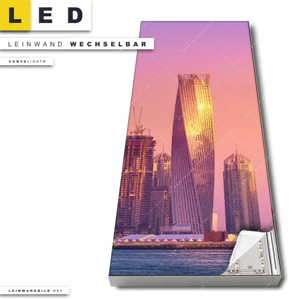 Du konfigurierst Dein individuelles LED Leinwandbild Canvalight® TEX | Sonnenaufgang in Dubai | Schmal und wir produzieren es NEU für Dich. Unsere Architektur - Gebäude, Städte - Skylines LED Bilder mit wechselbarer Textil-Leinwand sind KEINE Lagerware. Du bist Dir unsicher, welches Motiv oder Format das richtige für dein individuelles Canvalight® Leuchtbild ist, dann helfen wir dir gerne weiter und beraten dich!