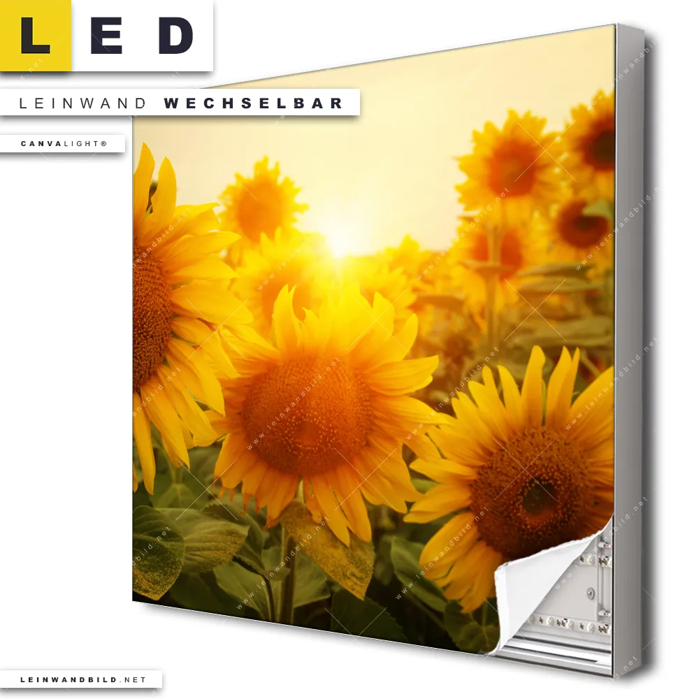 Du bist auf der Suche nach einem Landschaften, Blumen - Botanik LED Leinwandbild im Quadratischen Format? Begriffe wie Natur, Feld, Blumen, Blüten, Pflanzen, Blumenwiese, Sonnenblume, Sonnenuntergang haben Dich auf der Suche nach Deinem neuen XXL LED Wandbild mit wechselbarer Leinwand inspiriert? Farben wie Grün, Ocker, Orange dürfen auf Deinem neuen Leinwand-LED-Bild nicht fehlen und Leuchtbilder im Floral Stil passen perfekt zu Deinem Einrichtungsstil?