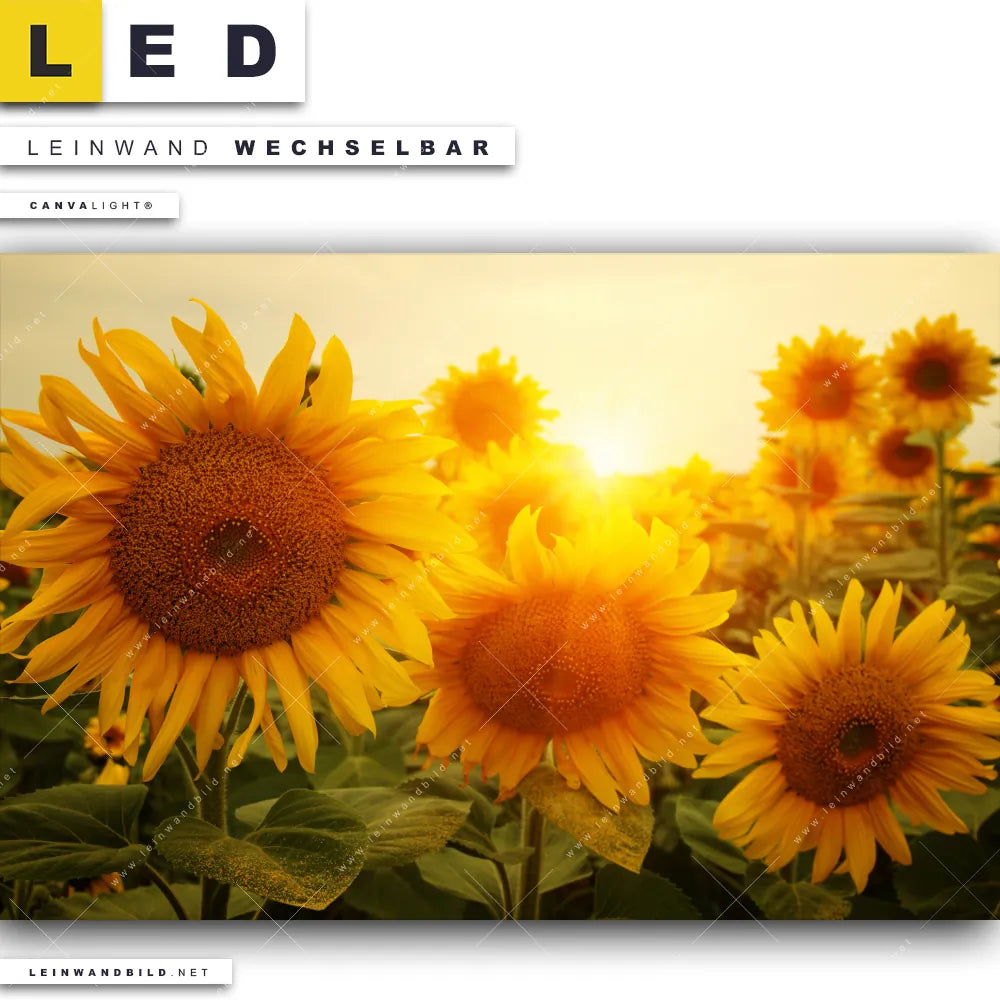 Du bist auf der Suche nach einem Landschaften, Blumen - Botanik LED Leinwandbild im Querformat? Begriffe wie Natur, Feld, Blumen, Blüten, Pflanzen, Blumenwiese, Sonnenblume, Sonnenuntergang haben Dich auf der Suche nach Deinem neuen XXL LED Wandbild mit wechselbarer Leinwand inspiriert? Farben wie Grün, Ocker, Orange dürfen auf Deinem neuen breiten Leinwand-LED-Bild nicht fehlen und Leuchtbilder im Floral Stil passen perfekt zu Deinem Einrichtungsstil?