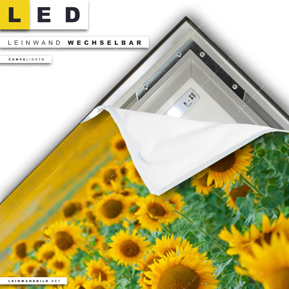 Du konfigurierst Dein individuelles LED Leinwandbild Canvalight® TEX | Sonnenblumenfeld | Querformat und wir produzieren es NEU für Dich. Unsere Landschaften, Blumen - Botanik LED Bilder mit wechselbarer Textil-Leinwand sind KEINE Lagerware. Du bist Dir unsicher, welches Motiv oder Format das richtige für dein individuelles Canvalight® Leuchtbild ist, dann helfen wir dir gerne weiter und beraten dich!