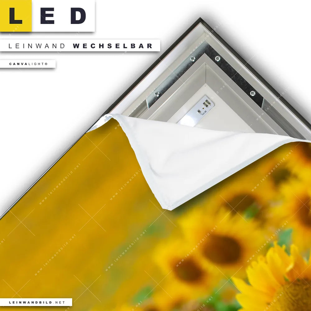 Du konfigurierst Dein individuelles LED Leinwandbild Canvalight® TEX | Sonnenblumenfeld | Schmal und wir produzieren es NEU für Dich. Unsere Landschaften, Blumen - Botanik LED Bilder mit wechselbarer Textil-Leinwand sind KEINE Lagerware. Du bist Dir unsicher, welches Motiv oder Format das richtige für dein individuelles Canvalight® Leuchtbild ist, dann helfen wir dir gerne weiter und beraten dich!
